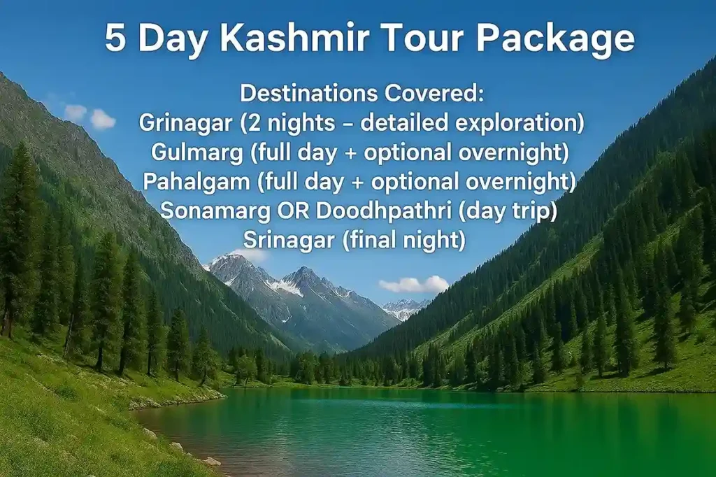 Destinations Covered | 2–3 major locations (Srinagar, Gulmarg) | 4–5 major locations (Srinagar, Gulmarg, Pahalgam, Sonamarg) |
