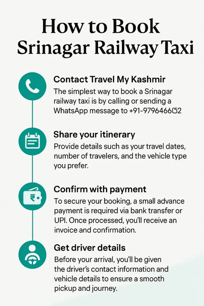 To get a taxi at the Srinagar Railway Station, you can pre book a cab through Travel My Kashmir, a local cab service provider in Kashmir .Note that popular ride sharing apps like Uber and Ola are not available in Srinagar. You can contact Travel My Kashmir via phone or WhatsApp at +91-9796466052 to confirm bookings and payments for rides to destinations like Gulmarg, Pahalgam or the local city.