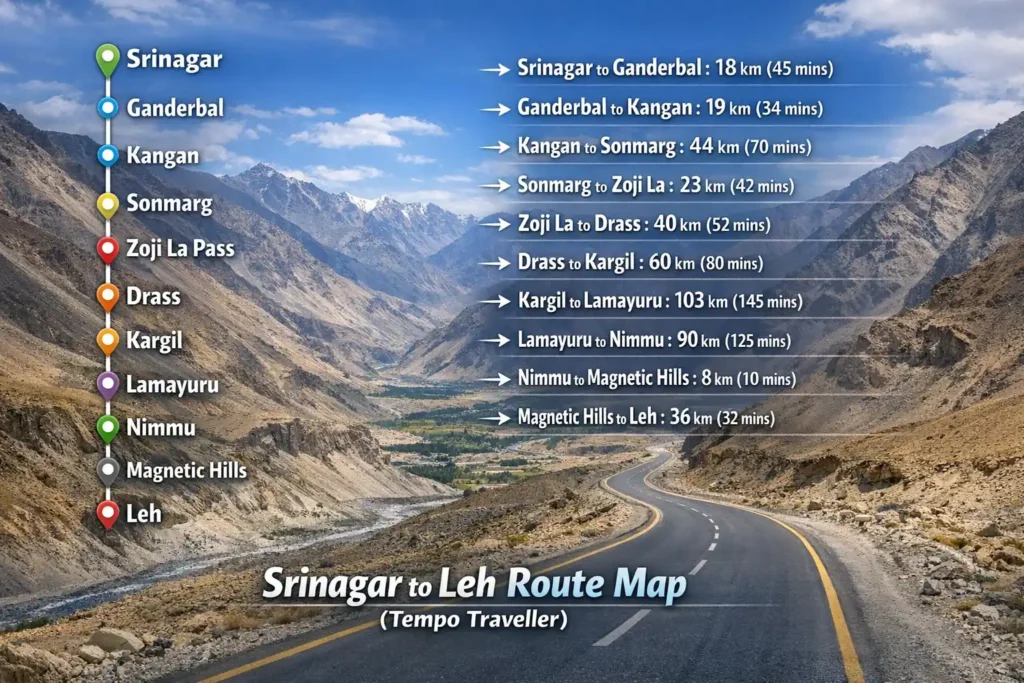 The cost of a 17-seater tempo traveller from Srinagar to Leh is approximately ₹32,000 for a one-way drop. This fare typically includes travel up to Leh town, Ladakh, including your hotel or main market drop-off.
