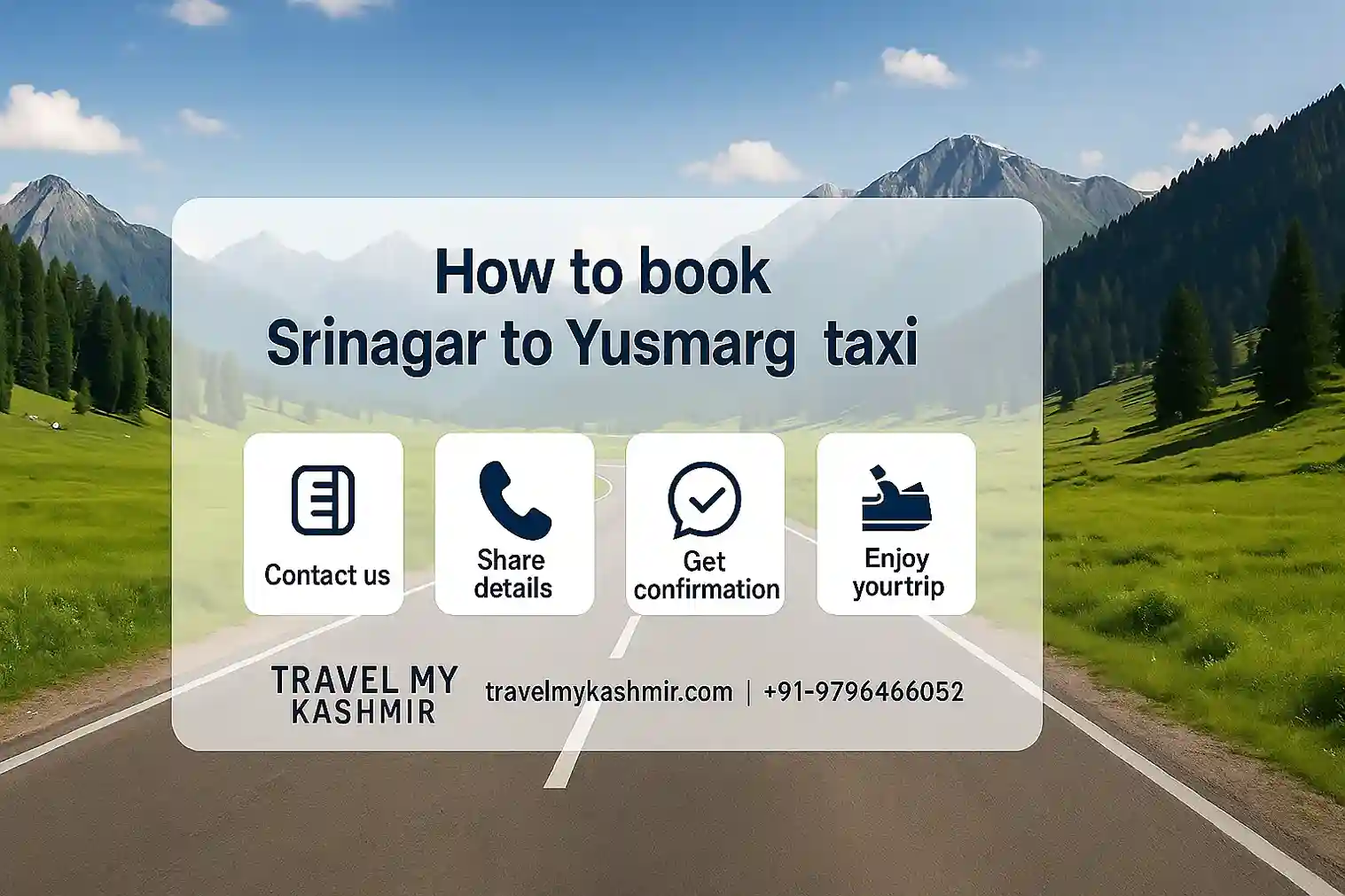 Booking your Srinagar to Yusmarg taxi is simple and hassle-free. Contact us via phone, WhatsApp or our online booking form. Provide your travel date, time and vehicle preference and receive instant confirmation with driver details. We ensure your cab arrives on time at your designated pickup location in Srinagar. For instant booking call us at +91-9796466052